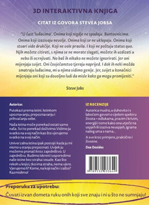 Ova knjiga nije roman s nekom radnjom i glavnim licima. Zapravo, glavno lice ste vi - čitatelj. Drukčija je to knjiga, knjiga samo po obliku, a po sadržaju čitav duhovni svemir. Možete je i čitati redom koji sami odaberete . Autorica vam je njome dala u ruke svjetiljku za osvjetljavanje životnoga puta. Jer ponekad se izgubimo, zalutamo ili jednostavno izgubimo snagu. U ovoj knjizi svatko će prepoznati djelić, i ne samo djelić, sebe. Naći nešto za jačanje duha i njegove istine. Ovo nije jedna od onih knjiga koje se samo pročitaju.